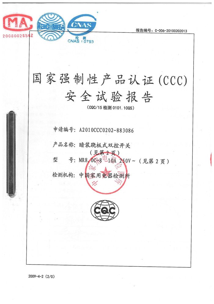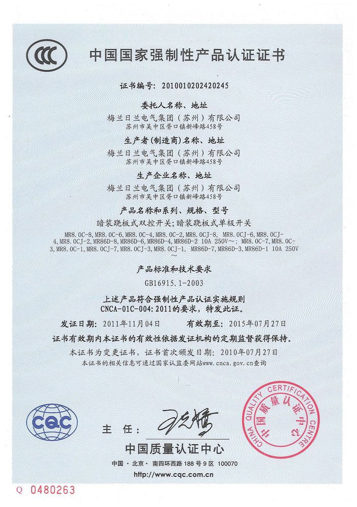 MR8.0C開關(guān) 86D插座資質(zhì)證書