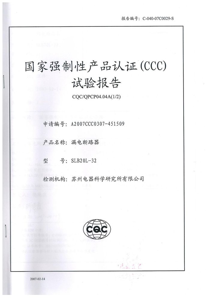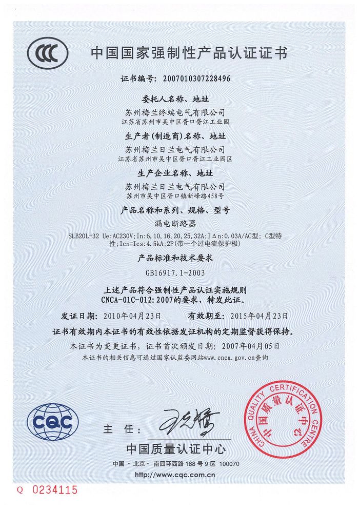 SLB20L-32漏電斷路器資質(zhì)證書(shū)