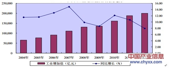 2004-2012年中國工業(yè)增加值及其變化趨勢(shì)