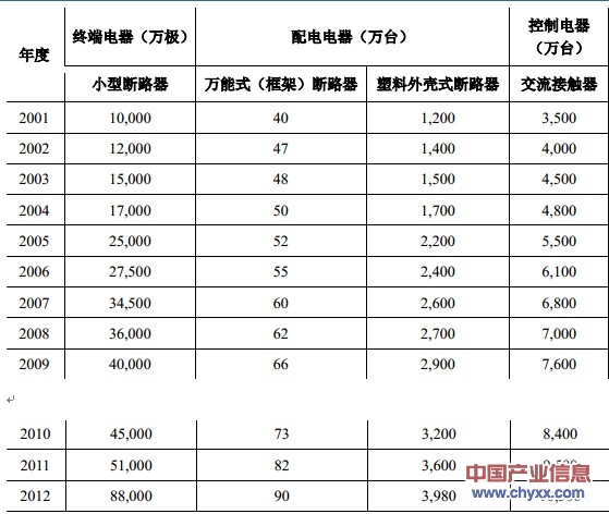 根據(jù)中國電器工業(yè)協(xié)會(huì)的統(tǒng)計(jì),2001 年至 2012 年主要低壓電器產(chǎn)品的產(chǎn)銷量呈逐年上升趨勢(shì),低壓電器產(chǎn)品保持較快速度增長,終端電器、配電電器、控制電器產(chǎn)量復(fù)合增長率分別為 21.86%、11.41%、10.50%,今后較長一段時(shí)間內(nèi)我國低壓電器市場容量仍會(huì)穩(wěn)步增長。