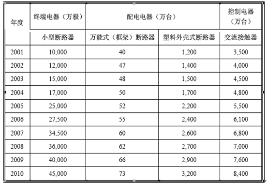 根據(jù)中國電器工業(yè)協(xié)會的統(tǒng)計,2001 年至2010 年主要低壓電器產(chǎn)品的產(chǎn)銷量呈逐年上升趨勢,低壓電器產(chǎn)品保持較快速度增長,終端電器、配電電器、控制電器產(chǎn)量復合增長率分別為18.19%、11.39%、10.22%,今后較長一段時間內(nèi)我國低壓電器市場容量仍會穩(wěn)步增長。