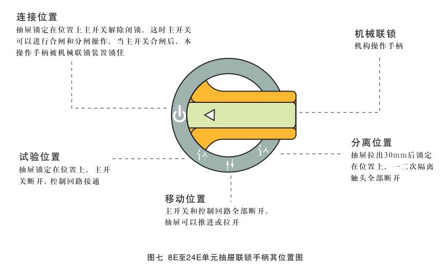 8E/4, 8E/2單元抽屜的操作:這種操作是通過對(duì)抽屜面板上的手柄進(jìn)行操作實(shí)現(xiàn)的,見圖六。只有當(dāng)手柄上的白箭頭指示“移動(dòng)位置”(↑↓)時(shí),抽屜方可抽出或插入,在其它任何位置上,抽屜都應(yīng)被鎖定,因此不可能對(duì)抽屜實(shí)施抽出或插入操作。此時(shí)不可硬拉或硬拖以免損壞機(jī)械聯(lián)鎖機(jī)構(gòu),抽屜從連接位置抽出30mm(此時(shí)手中工件一輕微震頗感)時(shí)將操作手柄向逆時(shí)針方向轉(zhuǎn)過45°,抽屜即被鎖定在“分離位置”(↑↓)此時(shí)一次和二次隔離插件均己脫離電網(wǎng)并形成安全間隔。