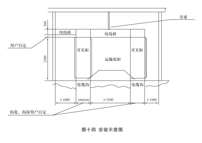 安裝:開關(guān)柜就位。找準(zhǔn)位置,按圖十一所示進(jìn)行焊接,焊接節(jié)柜和焊長(zhǎng)由用戶確定,產(chǎn)品安裝與配電室的相對(duì)位置參考圖十二,其中吊索是否安裝由用戶確定,制造商提供的原則是:當(dāng)母線橋的長(zhǎng)度大于3米時(shí)應(yīng)考慮安裝吊索。但是,當(dāng)母線橋的電流大于或等于2500A時(shí),其長(zhǎng)度為2.5米時(shí)也應(yīng)安裝吊索。